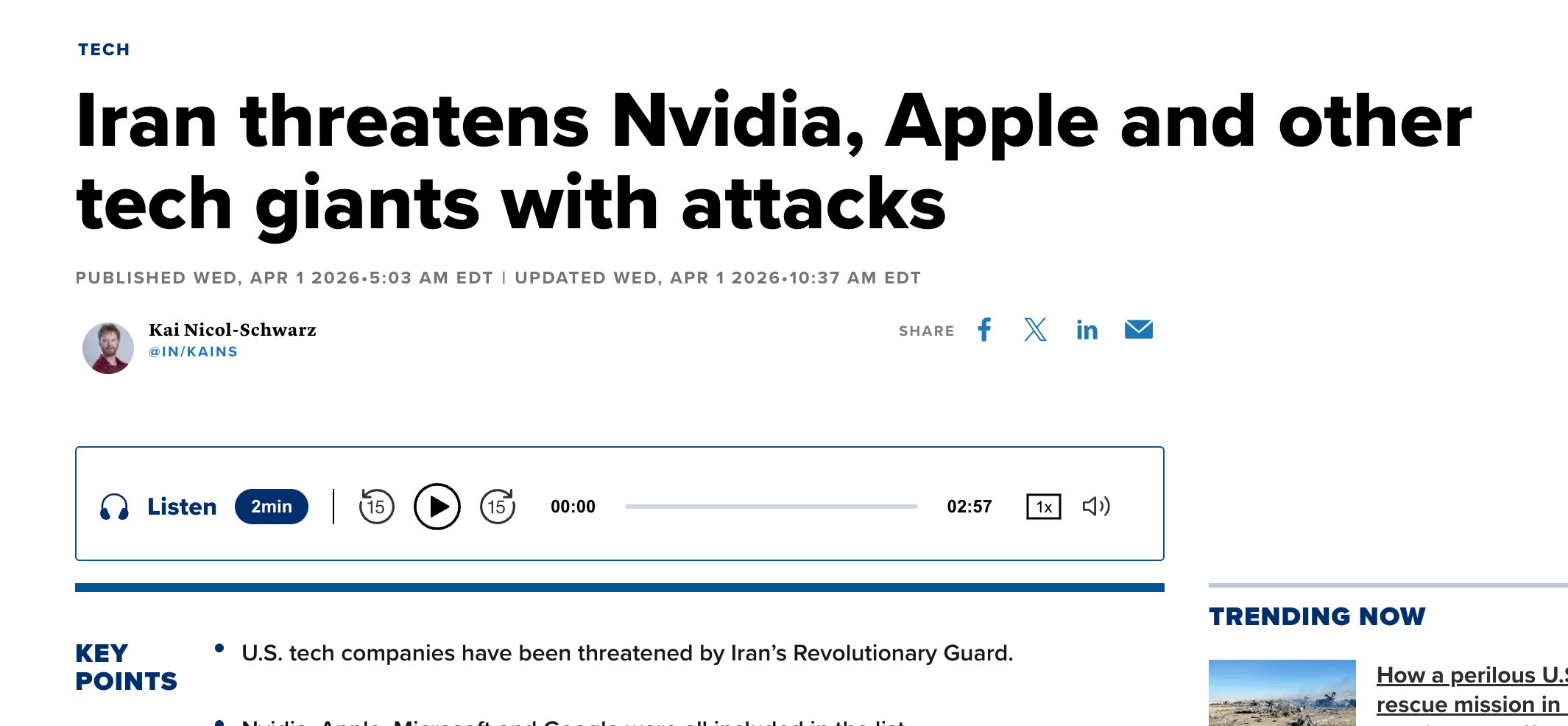 This one caught my attention. Iran named 18 U.S. tech and defense companies as targets for further assassination attempts. The list includes Palantir, META, Google, and Microsoft.